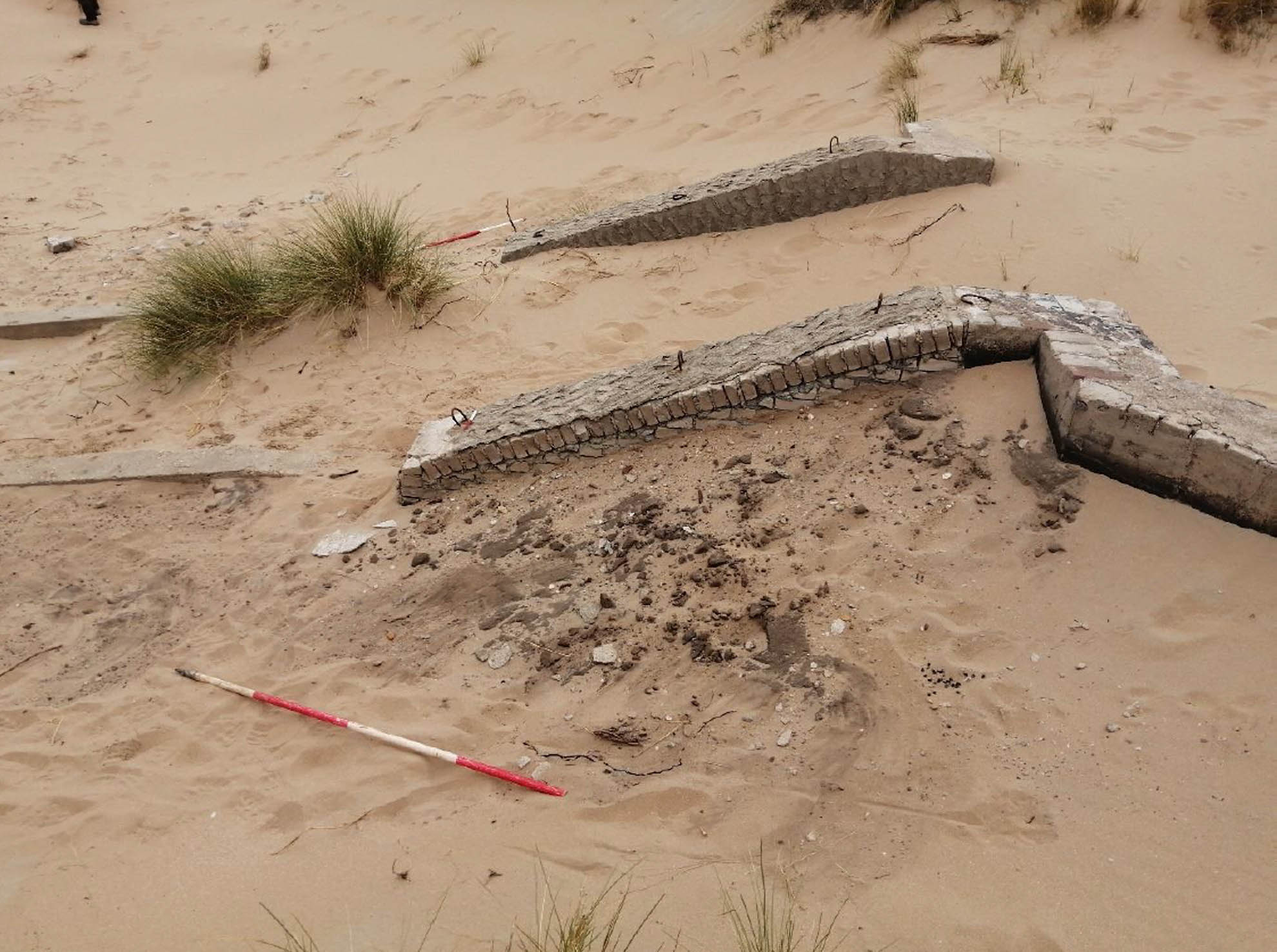 Bij één van die zoeklichtopstellingen was een nieuwe duinpan uitgestoven. Hierdoor ontdekten de onderzoekers een uitgestrekte vindplaats uit de Tweede Wereldoorlog rondom de gebouwde, betonnen resten. Ze troffen restanten van prikkeldraadversperringen aan waarvan de houten paaltjes nog intact waren, en grote vlakken die waren bedekt met plaggen. Deze meer vergankelijke onderdelen van het gebouwde landschap worden wel ‘zachte’ resten genoemd. Ook vonden ze voorwerpen uit die periode, zoals patroonhulzen, verbindingskabels en stukken van bierflesjes. Door de aard van de resten was het nodig om hier archeologische expertise bij te betrekken.